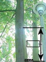 3. Sprawdź, na którym z zaznaczonych drzew rosnących na stanowisku B2 znajduje się dziupla dzięcioła czarnego. Określ na oko wysokość położenia dziupli na klonie. Wynik zaznacz na rysunku.
